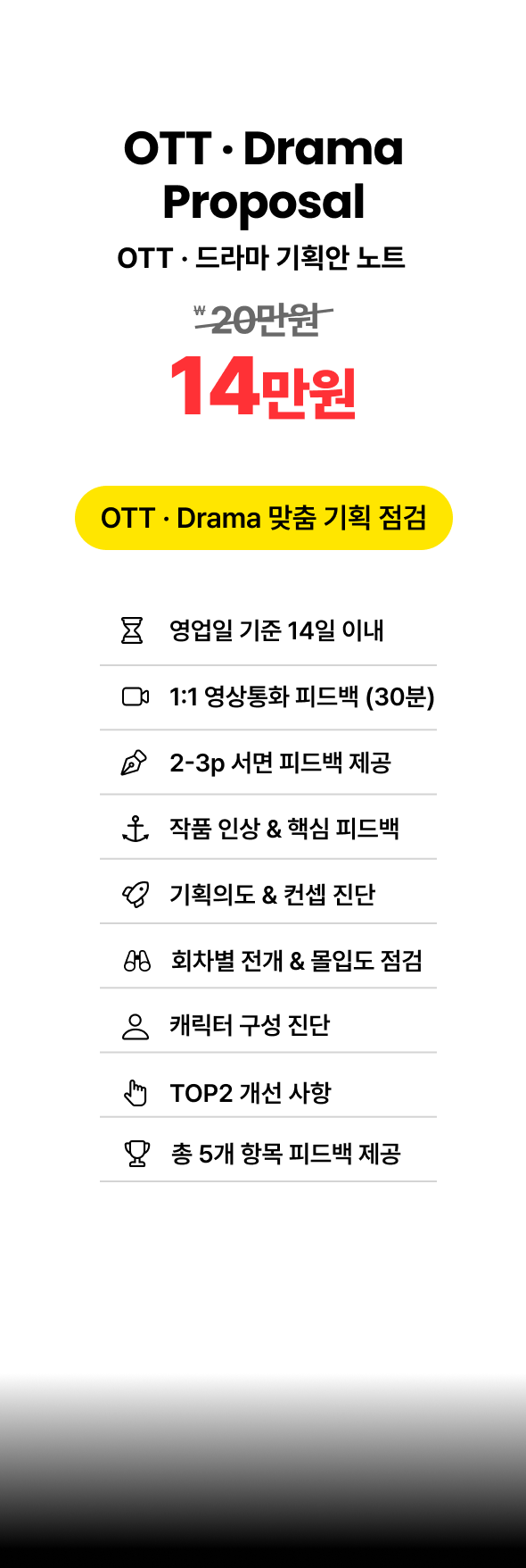 • 기획안 · 트리트먼트 · 시나리오가 접수되어 피드백 작업이 개시된 이후에는, 단순 변심이나 주관적 판단(예: 피드백 퀄리티 불만족)에 의한 환불되지 않습니다.